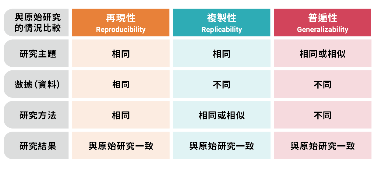 - 複製性(replicability):針對相同的科學問題,使用不同的數據(資料),利用相同或相似的研究方法進行分析之後,得到一致的結果。