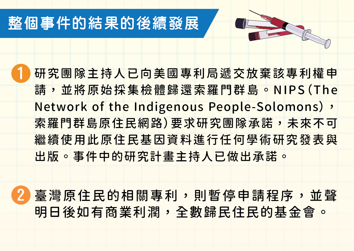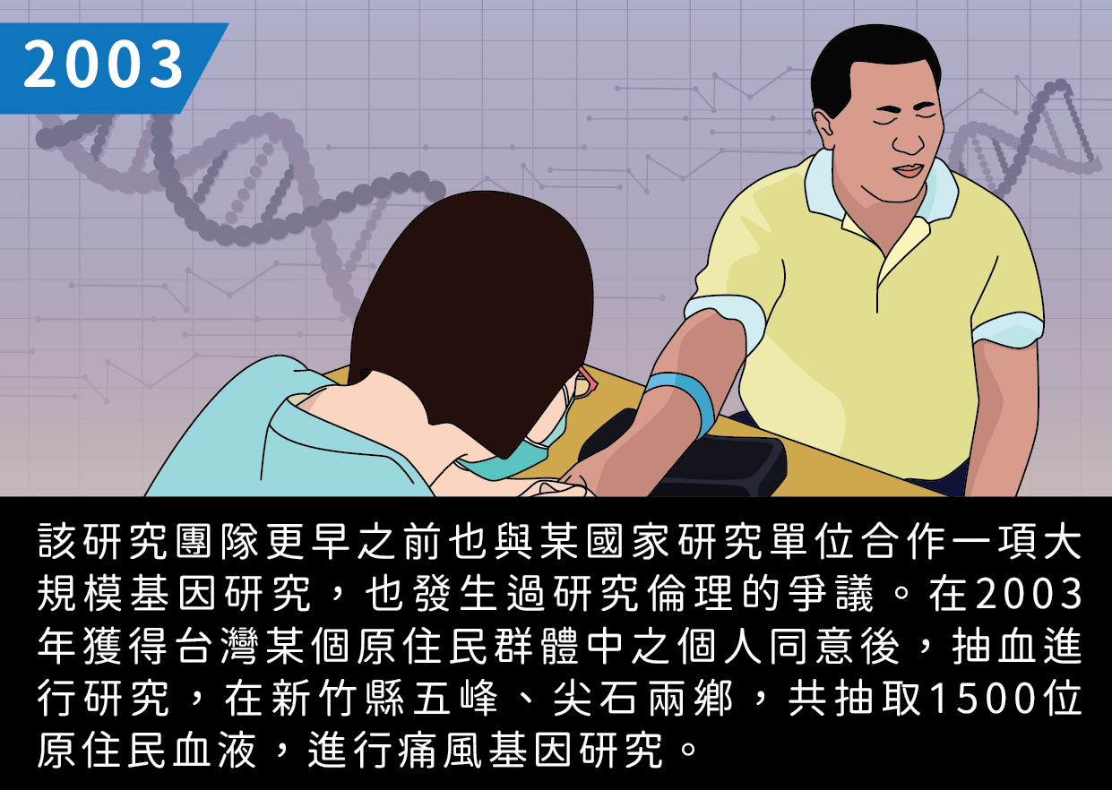 Q2:本案例中,該研究團隊在2003年獲得臺灣某個原住民族群中之個人同意後,便進行研究。請問此做法在知情同意的程序上有何疏漏?是否取得族群同意後再進行會更妥當?(此為開放式問題) |