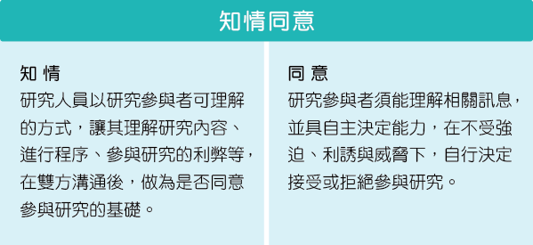 「知情同意」可分為知情與同意兩部分,知情指的是研究人員使用研究參與者能夠理解的方式,讓其理解研究內容、進行的程序、參與研究的利弊等,經過雙方溝通後,做為是否同意參與研究的基礎。同意指的是研究參與者在不受控制的情境中,做出願意參與研究的決定。因此,需考量研究參與者的決定能力與自主性,也就是說研究參與者須能理解相關訊息,並具自主決定能力,在不受強迫、利誘與威脅下,接受或拒絕參與研究(D’Souza et al., 2015; Fraval, Chandrananth, Chong, Tran, & Coventry,2015)。因此,臨床研究人員必須於研究進行前,向潛在受試者充分說明完整的受試過程、各種可能發生的傷害及求助資訊(例如:人體研究法第14條第一項1~9款、醫療法第79條第三項1~8款),尊重其自主參加研究的意願(蔡甫昌,2017)。