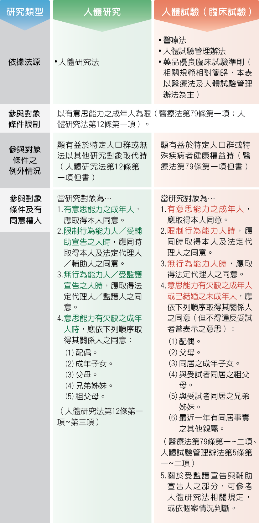 在人體試驗,醫療法規範當受試者為限制行為能力人時,應同時取得本人及法定代理人之同意;為無行為能力人時,應取得法定代理人之同意;欲以受監護宣告人為受試者時,由於受監護宣告人為無行為能力,應取得監護人(法定代理人)之同意;受輔助宣告人僅在特定行為時被視為限制行為能力,可參考人體研究法相關規定,或依個案情況判斷。當受試者為意思能力有欠缺之成年人時,同樣依法定順位取得關係人之同意;惟需注意的是,法定有同意權關係人之順位在人體研究法與人體試驗管理辦法裡略有不同(參考下表)。